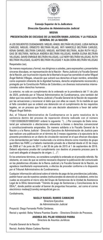 A nuestra página ha llegado el presente documento de la fiscalía colombiana en el cual pide disculpas por el encarcelamiento prolongado a personas de haber sido acusado de pertenecer a las FARC. El reconocimiento viene a constatar la utilización tanto de los aparatos de la «justicia» como represivos, de los procesos investigativos como herrmientas de la represión cuyo fundamento en la construcción del enemigo interno, la aplicación del derecho penal del enemigo y las políticas contrainsurgentes todas ellas destinadas a la represión y persecución del pueblo en lucha por sus justas demandas. Si uno escarbara aun más en las numerosas sentencias bien se podrían encontrar muchos otros casos similares donde la justicia no ha actuado desde la imparcialidad y la presunción de inoncencia, que es lo que corresponde a cualquier sistema judicial que respete y se enmarque dentro del derecho burgués y que respete a la vez los tratados internacionales. Pero eso no sucede. La lucha por abrir de par en par las cárceles y poner en libertad inmediata a todos los presos políticos, terminar con la judicialización y criminalización de la lucha política y social de conjunto del pueblo y de los trabajadores sigue siendo una tarea ardua aunque necesaria y urgente. Quienes deseen una paz efectiva para Colombia no sólo deben abrazar todos los cambios estructurales que el sistema de explotación capitalista requiere para avanzar hacia una sociedad que no esté dominada ni centrada en la minoriía social ociosa y parasitaria sino también deben terminar con la utilización del sistema judicial como herramienta de guerra contra el pueblo.